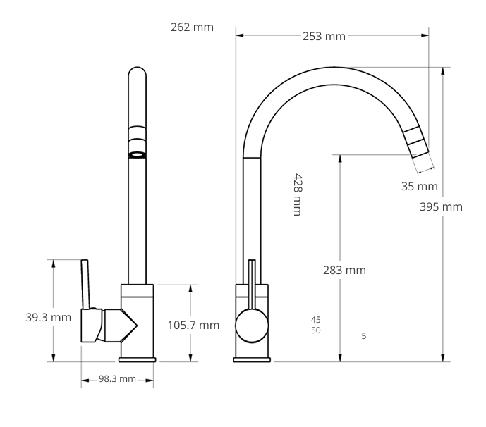 Zasięg wylewki wynoszący 262 mm oraz wysokość 428 mm zapewniają komfort użytkowania w różnych sytuacjach kuchennych.
