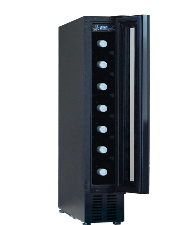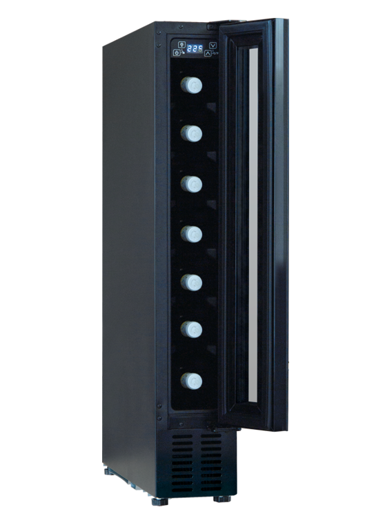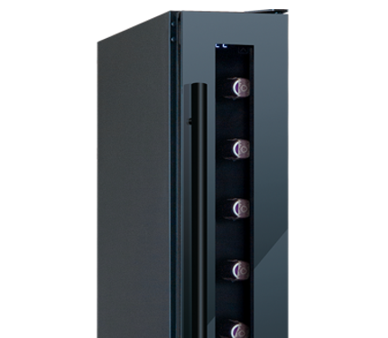 Szklane drzwi w kolorze czarnym dodają winiarce elegancji, a jednocześnie umożliwiają podziwianie zawartości. Wysokość szklanego frontu wynosi 71,4 cm, co sprawia, że winiarka świetnie komponuje się w zabudowie kuchennej.