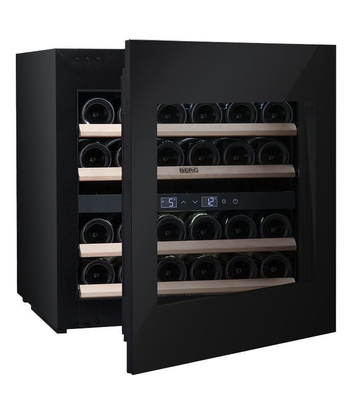 Dwuwarstwowe szklane drzwi z filtrem UV w kolorze czarnym dodają winiarce elegancji, a jednocześnie umożliwiają podziwianie zawartości. Wysokość szklanego frontu sprawia, że winiarka świetnie komponuje się w zabudowie kuchennej.