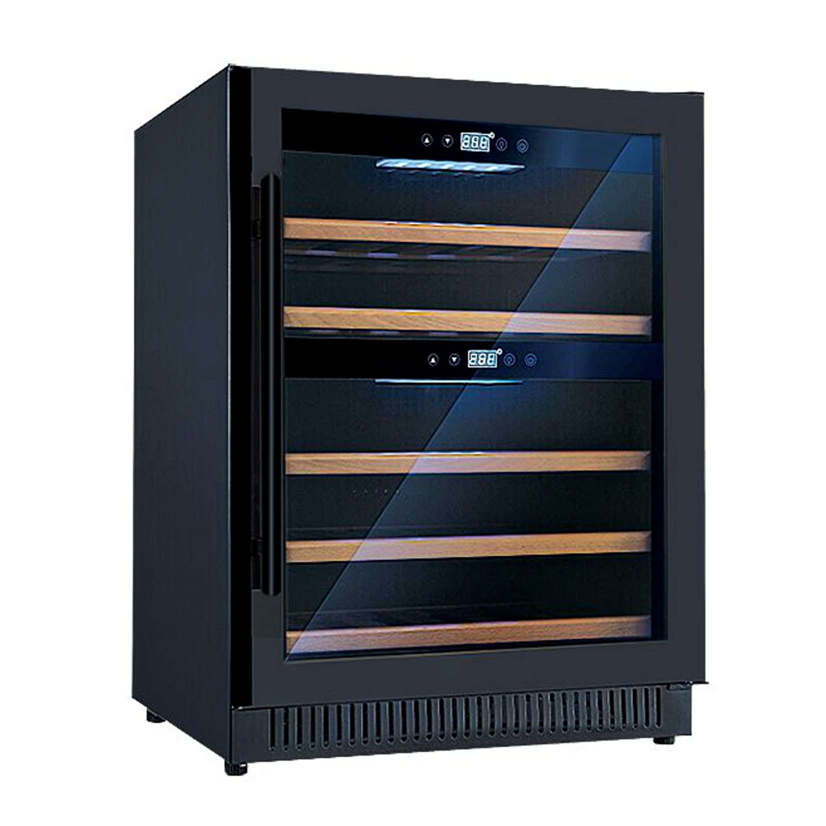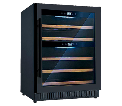 Dwuwarstwowe szklane drzwi z filtrem UV w kolorze czarnym dodają winiarce elegancji, a jednocześnie umożliwiają podziwianie zawartości. Wysokość szklanego frontu sprawia, że winiarka świetnie komponuje się w zabudowie kuchennej.
