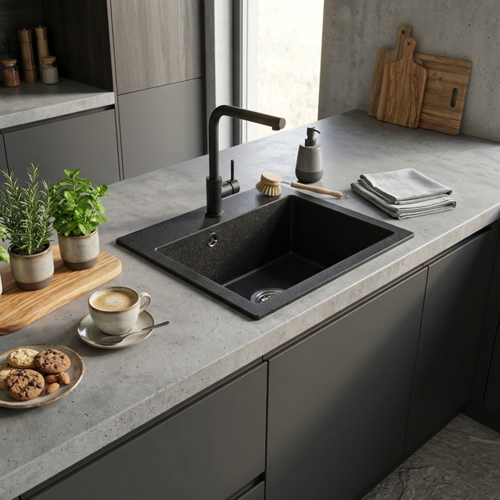 Dzięki zastosowaniu mikrocząsteczek granitu w procesie produkcyjnym, powierzchnia zlewozmywaka zyskuje wyjątkową twardość i odporność na typowe kuchenne wyzwania. To połączenie naturalnej wytrzymałości granitu z precyzją inżynierii materiałowej sprawia, że zlew jest praktycznie niezniszczalny w codziennej eksploatacji, stanowiąc idealne rozwiązanie nawet dla najbardziej wymagających kuchni.