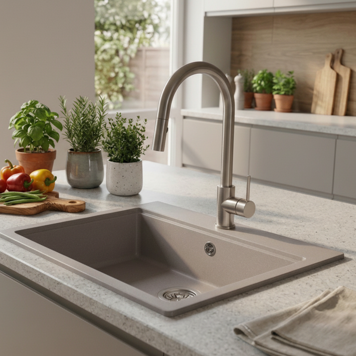 Dzięki zastosowaniu mikrocząsteczek granitu w procesie produkcyjnym, powierzchnia zlewozmywaka zyskuje wyjątkową twardość i odporność na typowe kuchenne wyzwania. To połączenie naturalnej wytrzymałości granitu z precyzją inżynierii materiałowej sprawia, że zlew jest praktycznie niezniszczalny w codziennej eksploatacji, stanowiąc idealne rozwiązanie nawet dla najbardziej wymagających kuchni.
