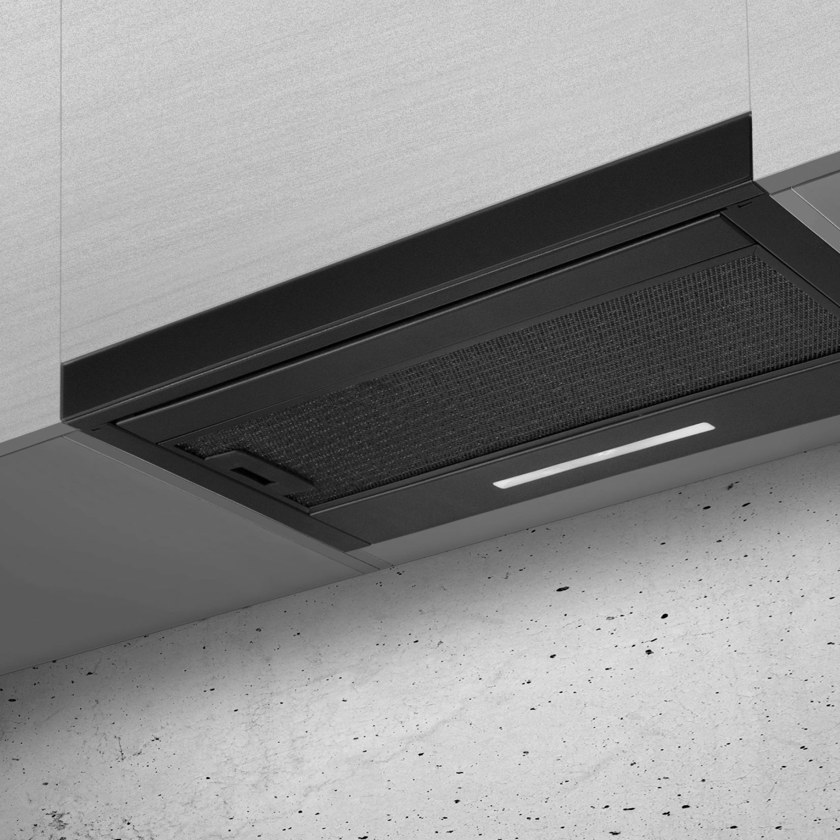 Elegancki i nowoczesny wygląd okapu,z wysuwanym panelem oraz głęboką czernią szkła, idealnie komponuje się z każdym stylem kuchennym – od minimalistycznych wnętrz po industrialne aranżacje.