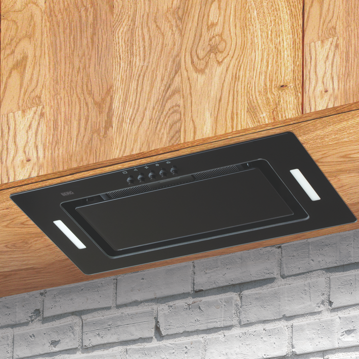 Elegancki i nowoczesny wygląd okapu, oparty na głębokiej czerni szkła i dopasowanych kolorystycznie przyciskach, tworzy uniwersalną stylistykę, która seamless integruje się z każdym stylem kuchennym.