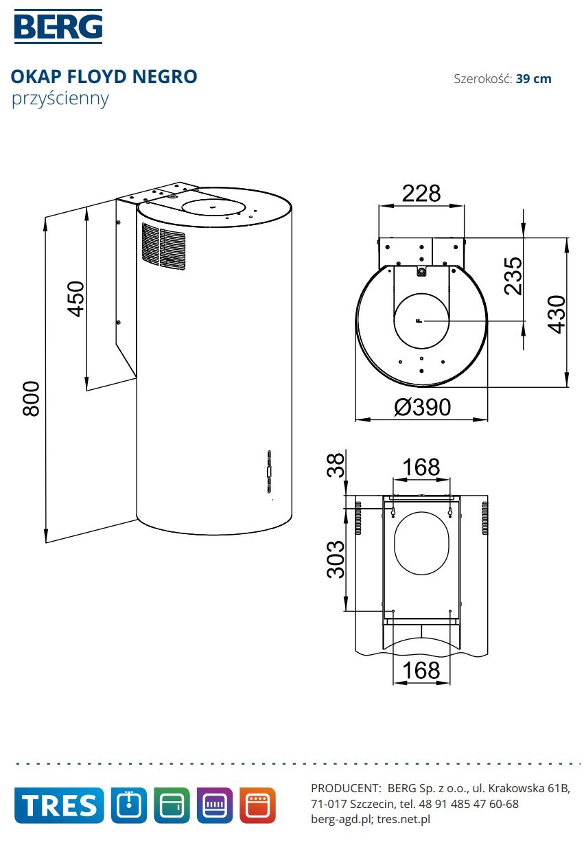 Okap przyścienny FLOYD NEGRO o średnicy 39 cm marki BERG to bardzo dobry wybór. Okap ma nowoczesny kształt tuby i jest sterowany elektronicznie - posiada funkcjonalny wyświetlacz. Sterowany za pomocą przycisków SOFT TOUCH. Okap może pracować jako wyciąg lub w obiegu zamkniętym jako pochłaniacz - wymagana jest do tego instalacja filtrów węglowych BM1.